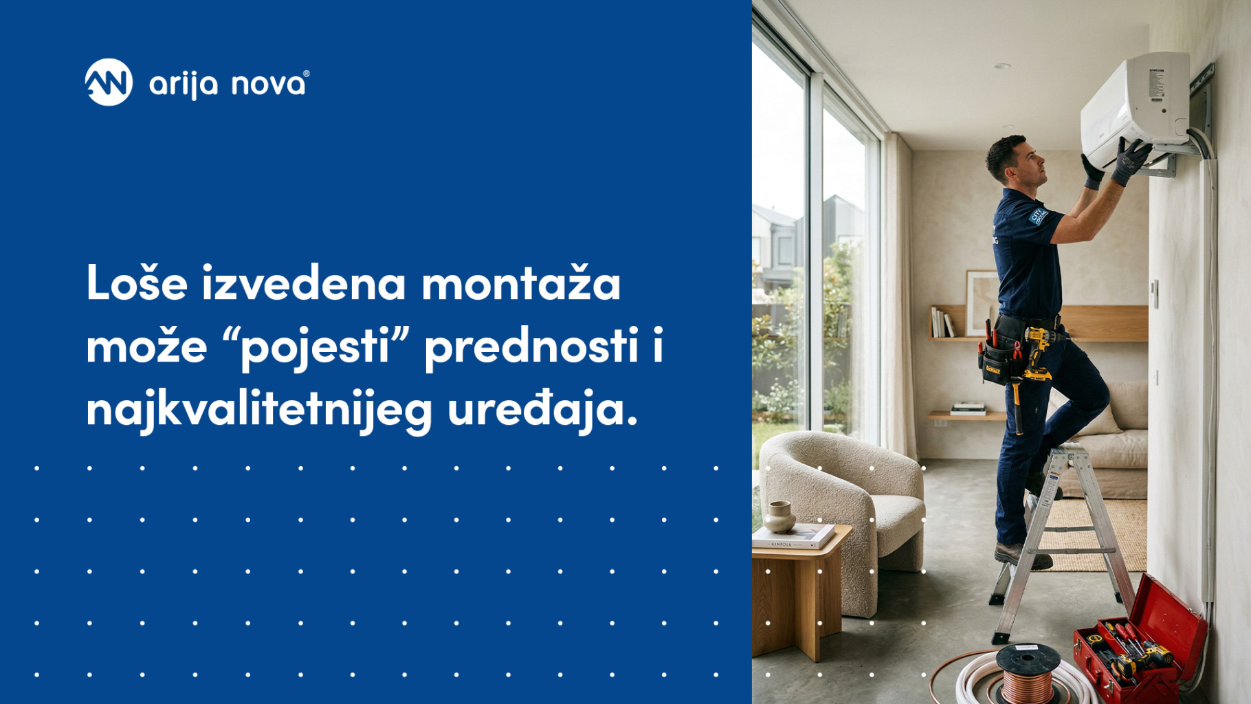Energetska učinkovitost ne završava kupnjom. Loše izvedena montaža može “pojesti” prednosti i najkvalitetnijeg uređaja. Neodgovarajuća pozicija unutarnje jedinice, preduge ili nepravilno izvedene instalacije, loša izolacija cijevi ili pogrešno dimenzioniran odvod kondenzata mogu dovesti do slabijeg učinka, povećane potrošnje i neugodne distribucije zraka.