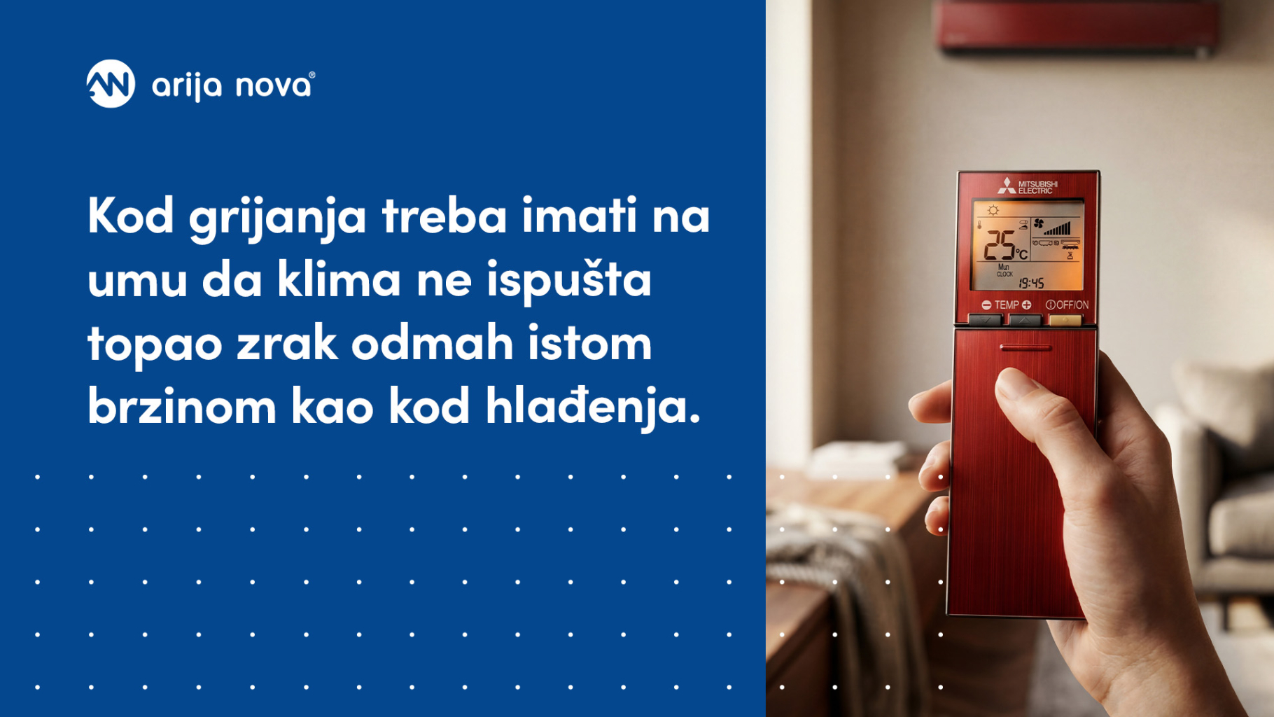 Kod grijanja treba imati na umu da klima ne ispušta topao zrak odmah istom brzinom kao kod hlađenja. Uređaj često kratko stabilizira rad prije nego što počne puhati topli zrak. To je normalno ponašanje i ne znači kvar.